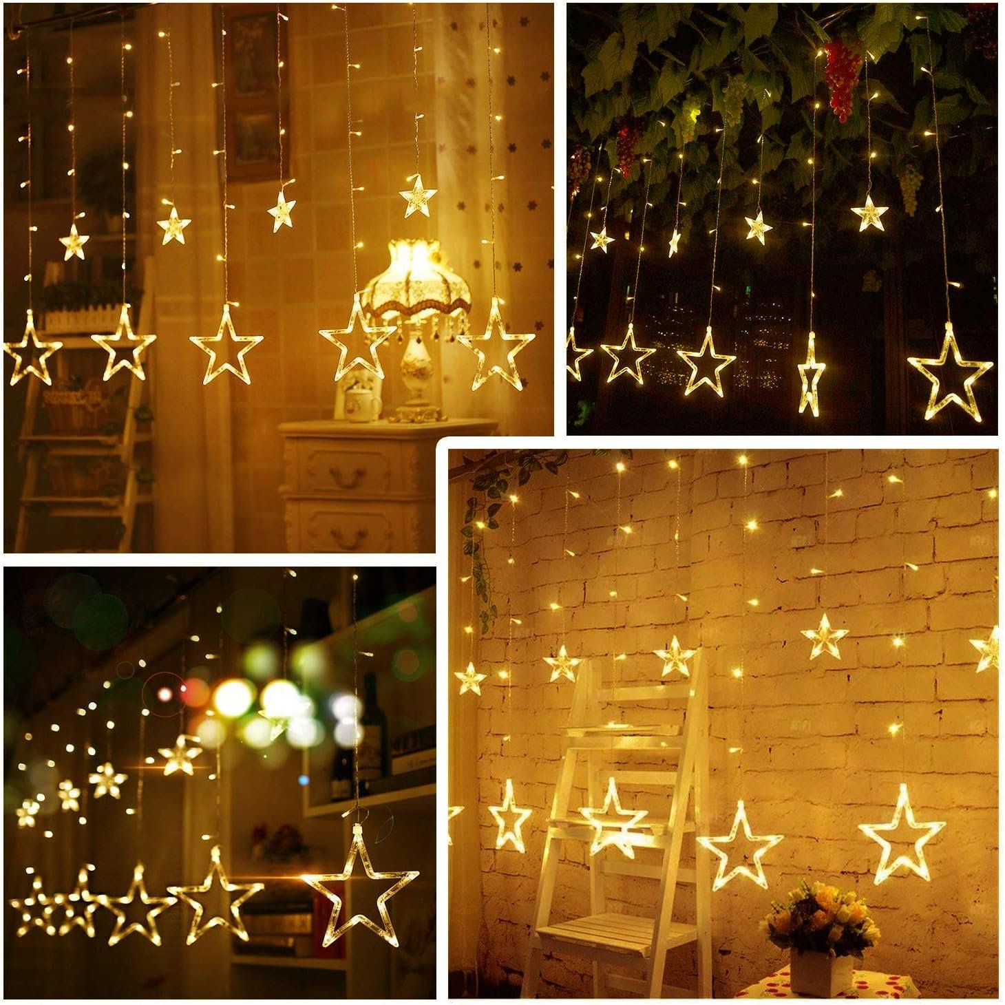 What makes these lights genuinely stand out is their unique structure. The complete curtain lights include 138 LEDs, and they feature 12-star ornaments, with six big and six small stars.